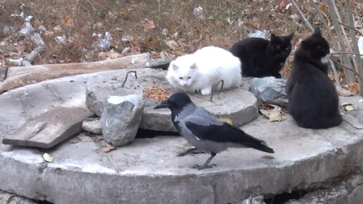 Смелая ворона отбирает корм у кошек.