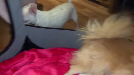 Малышка чихуахуа помогает воспитывать щенков шпицули.