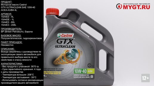 Моторное масло Castrol GTX ULTRACLEAN SAE 10W-40 ACEA A3/B4 4L #ANTON_MYGT