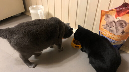 Наш серый Тёма позволяет Чернышу спокойно покушать из своих мисок.