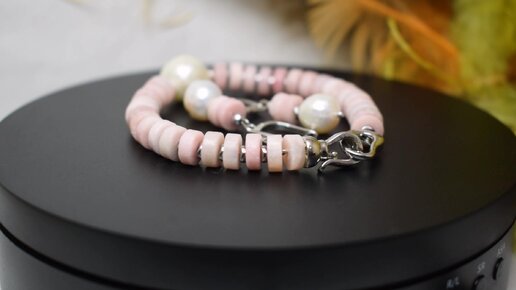 Комплект из браслета и серёжек. Натуральный розовый опал и крупный жемчуг!