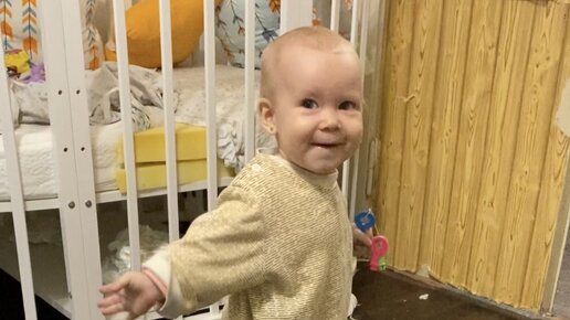 Малышка (1 год 1 мес) пошла и на радостях засмеялась.
