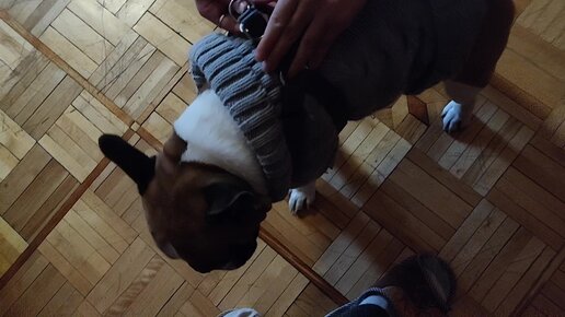 Свитер новый ,а привычки старые. Французский бульдог не хочет одеваться на прогулку.