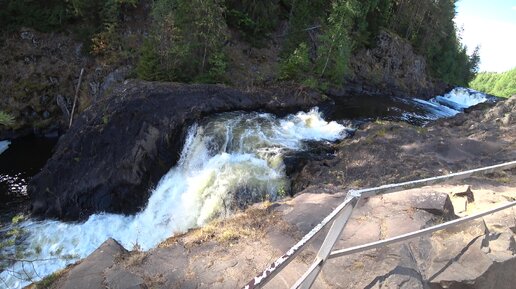 Посетили большой водопад "Кивач" в Карелии. Туристы фотографируются на фоне падающей воды