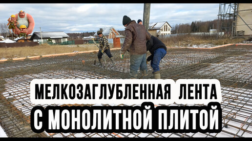 Мелкозаглубленный ленточный фундамент с монолитной плитой сверху.