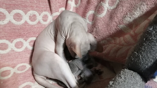 Утренние процедуры. Мама кошка массируют животик малышке.