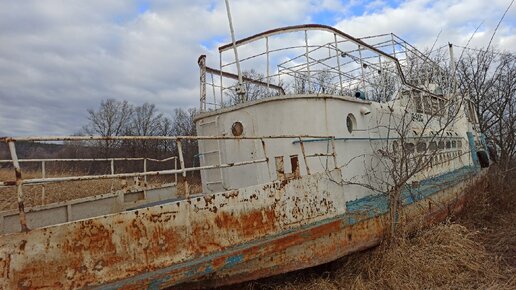 Вдали от воды стоит заброшенный теплоход Москвич. Как он тут оказался