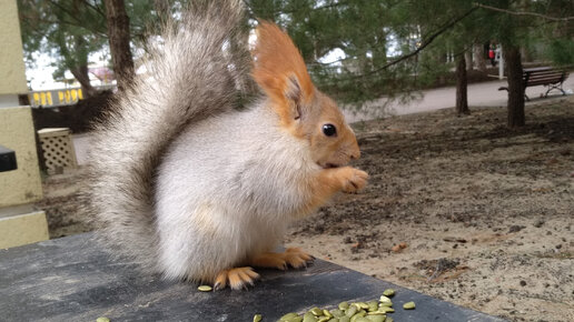 Покормила смешную белочку в зимней шубке у моря