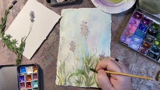 Рисунок лаванды акварелью на бумаге KHADI PAPERS A5 150 г 100% хлопок, среднезернистая.
