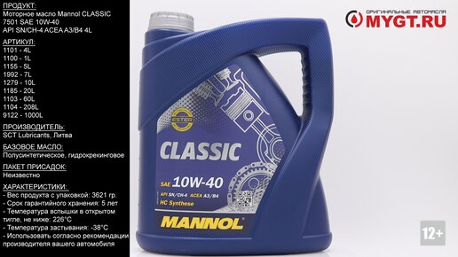Моторное масло Mannol CLASSIC 7501 SAE 10W-40 API SN/CH-4 ACEA A3/B4 4L #ANTON_MYGT