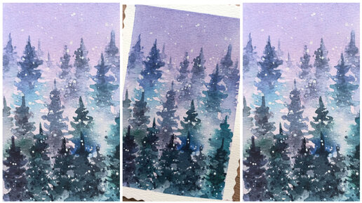 МК Новогодняя открытка своими руками - сказочный лес. Рисование акварелью.