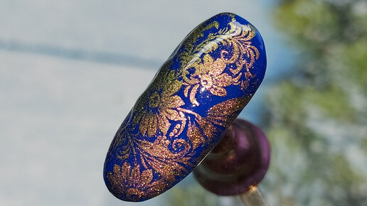 Как сделать стемпинг дизайн на ногтях: Нарядный маникюр на синем фоне при помощи зеркальной втирки