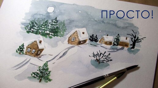 Рисуем зимний вечер в деревне. Новогодняя акварельная открытка