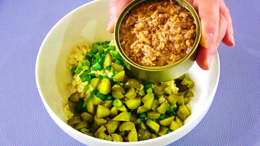 Полноценный ужин из одного блюда. Тунец, рис и маринованные огурцы.
