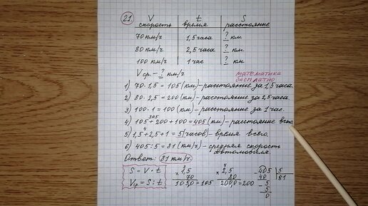 21) Первые 1,5 часа автомобиль ехал со скоростью 70 км/ч, следующие 2,5 часа - со скоростью 80 км/ч, а затем 1 час - со скорос
