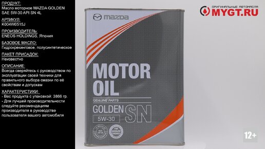 Масло моторное Mazda GOLDEN SAE 5W-30 API SN 4L #ANTON_MYGT