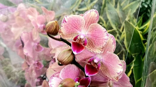 Праздничные витрины с орхидеями и другими цветами ко дню Матери в магазине Ашан г. Омск.