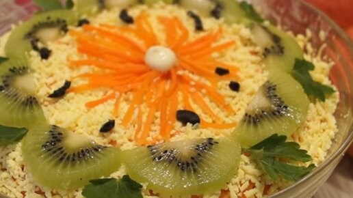 Салат из курицы с корейской морковью и киви, не сложный в приготовлении, оригинальный на вкус