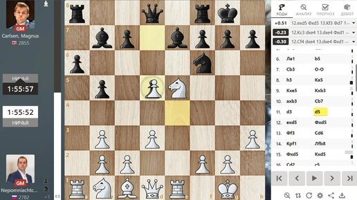 Первая игра Яна Непомнящего и Магнуса Карлсена (26.11.21, Дубаи). "Оба соперника не в лучшей форме", - высказался А. Грищук.