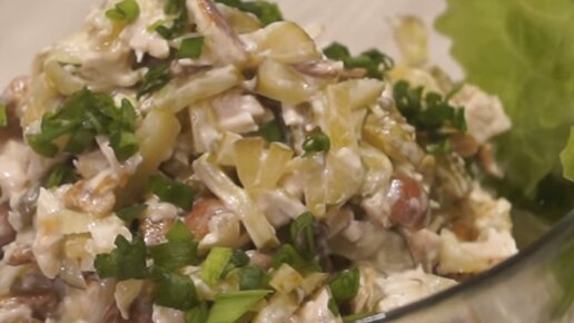 Салат с грибами, с неизбитым вкусом, в состав входят соления и нежное куриное мясо