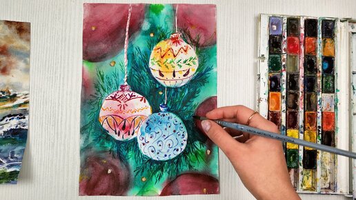 Как нарисовать ёлочные игрушки акврелью. Детский рисунок для начинающих