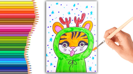 Рисунок на Новый год 2022. Как нарисовать новогоднего тигра. Урок рисования для детей - рисуем тигра