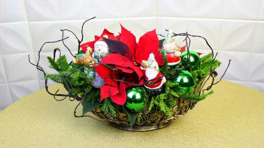 Собираем новогоднюю композицию с криптомерией и пуанцетией в вазе-ладье.