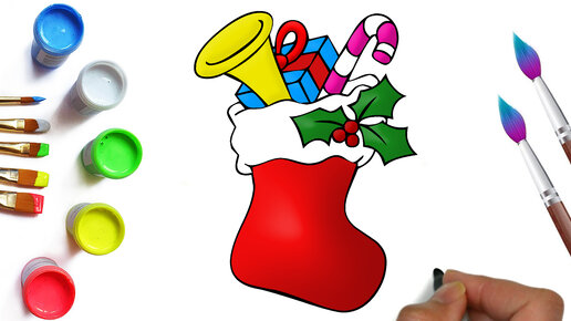 Как нарисовать рождественский носок или валенок для камина с подарками на новый год или рождество для детей и малышей легко
