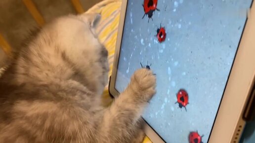 Смешной котенок играет на планшете.
