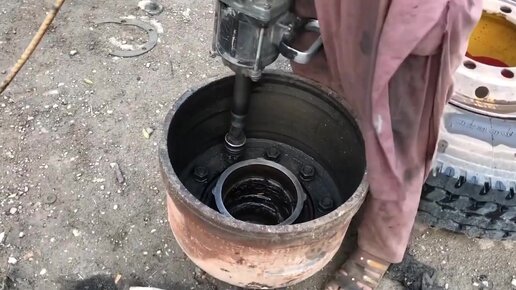 14-летний пацан показывает, как правильно добавлять смазку для подшипников колёс грузовика.