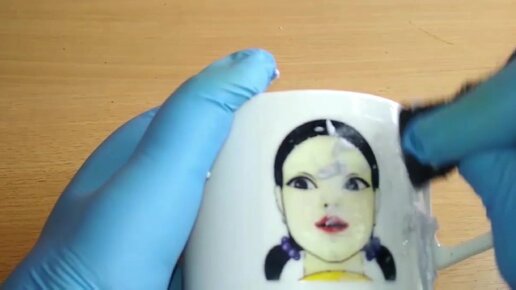 Фан-арт на Страшную Куклу из сериала Игра в кальмара, переносим на чашку.