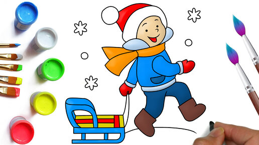 Как нарисовать мальчика с санками, зимние рисунки для детей, что можно нарисовать на праздник новый год или рождество
