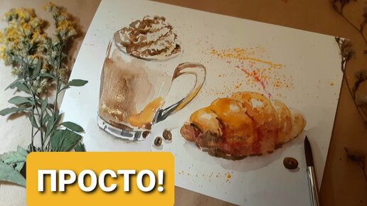 Рисуем кофе латте с круассаном акварелью