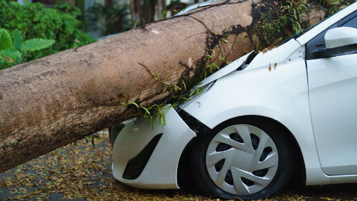 В Москве сильный ветер повалил дерево, сильно повредившее сразу три автомобиля