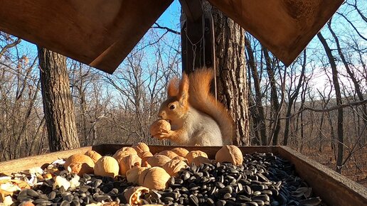 Белка вместе с птицами лакомится орехами и семенами, забавно держа еду в своих лапках!