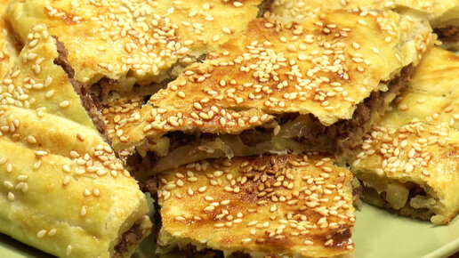 Быстрый пирог с говяжьим фаршем на размороженном бездрожжевом тесте.