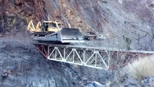 40 тонный бульдозер едет по маленькому мосту без машиниста