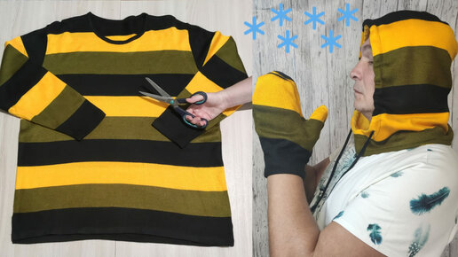 Переделала старый свитер в стильный и теплый головной убор + варежки!