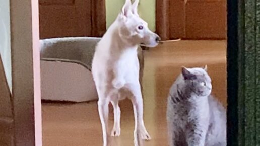 Кот и пёс испуганно смотрят, куда уносят их подружку. А кошка жалобно мяукает в переноске