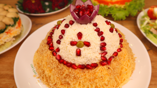 Эффектный и доступный в плане ингредиентов салат "Шапка Мономаха". Всегда ярко выделяется на Новогоднем столе