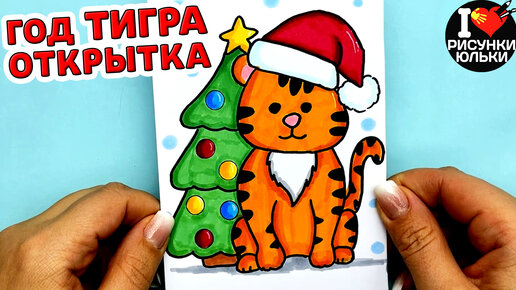 Как сделать открытку на Новый Год Тигра 2022. Рисуем Тигра с Елкой