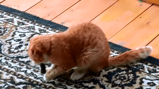 Сибирский кот поймал мышку и отдал рыжему коту. Теперь он наблюдает за игрой товарища.