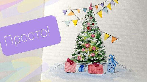Новогодняя ёлка с подарками и флажками. Рисунок акварелью