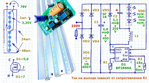 Устройство и принцип действия простого светодиодного светильника с драйвером на дросселе (230V, 27W), схема, её работа, нюансы