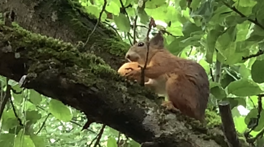 Белка утащила абрикосик и сушит его на дереве