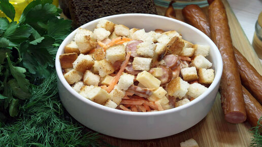 Очень вкусный и быстрый салат на новогодний стол. Делюсь рецептом салата с охотничьими колбасками и сухариками