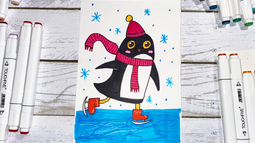 Рисуем новогоднего пингвина. Простой рисунок маркерами