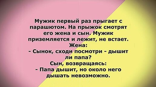 Мужик первый раз прыгает с парашютом. На прыжок смотрят его жена и сын. Мужик приземляется и лежит, не встает...