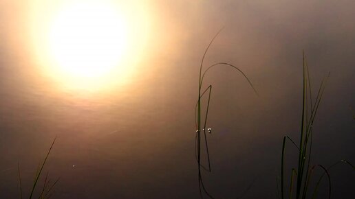 Травинка, туман, отражение солнца в воде....