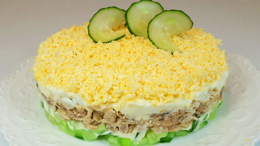 Слоеный салат за 5 минут с рыбной консервой, яйцом и огурцом. Салат на праздничный стол